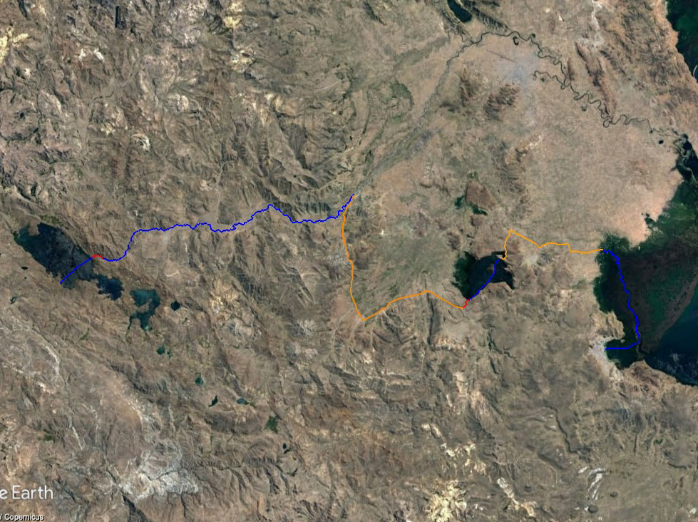 From the lake of Lagunillas at 4176m / 13701ft where flamingos nest. We'll cross to an island 400 X 800ft for night camping underneath the stars. The next morning we'll raft to the entrance of a small river, portage around a dam and impassable section then raft for 5 miles where it connects to the Juliaca river and raft another 25 miles to the town of Cabanillas. From there we take a car 22.5 miles through the town of Vilque in Puno until we are close to Lake Umayo. We'll walk a mile until we reach the shore then cross this by packraft, possibly stay 1 night on its' .7 X .65 mile island. In the morning we raft to ruins of Sillustani (Incan burial towers). After exploring the ruins we will take a car 12 miles to lake Titicaca where we will packraft 14 miles through channels of marsh and reeds then open water to the floating islands of Uros arriving at the port of Puno.