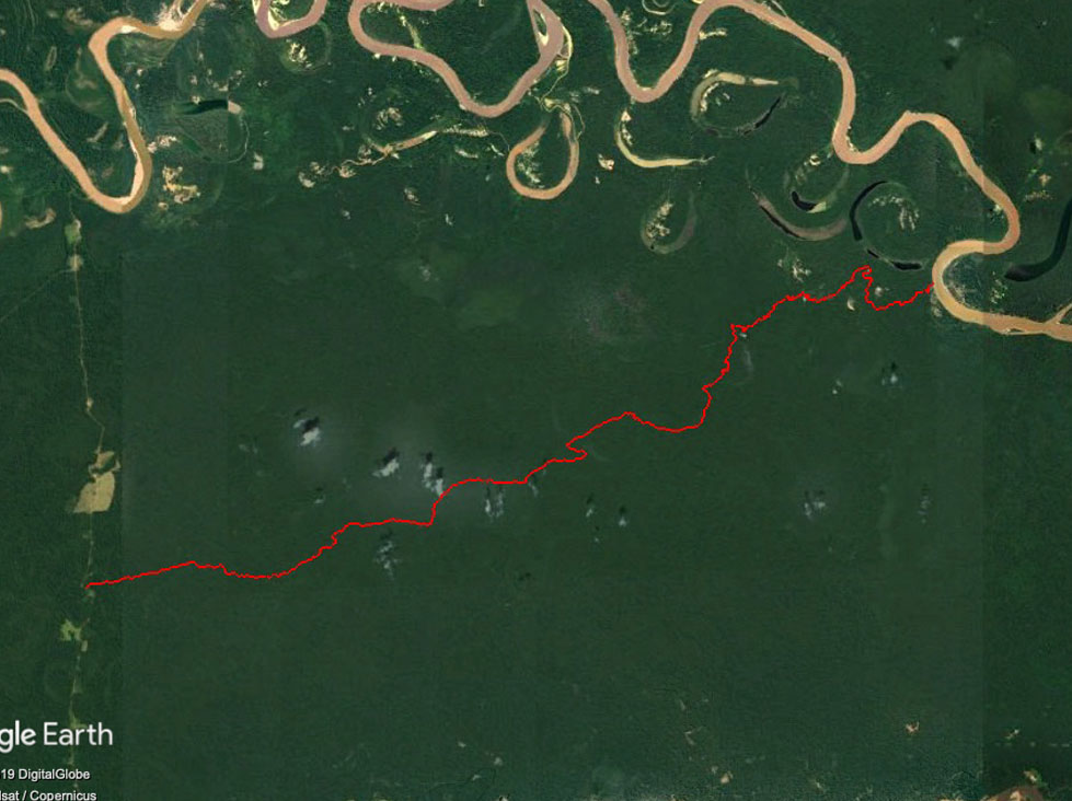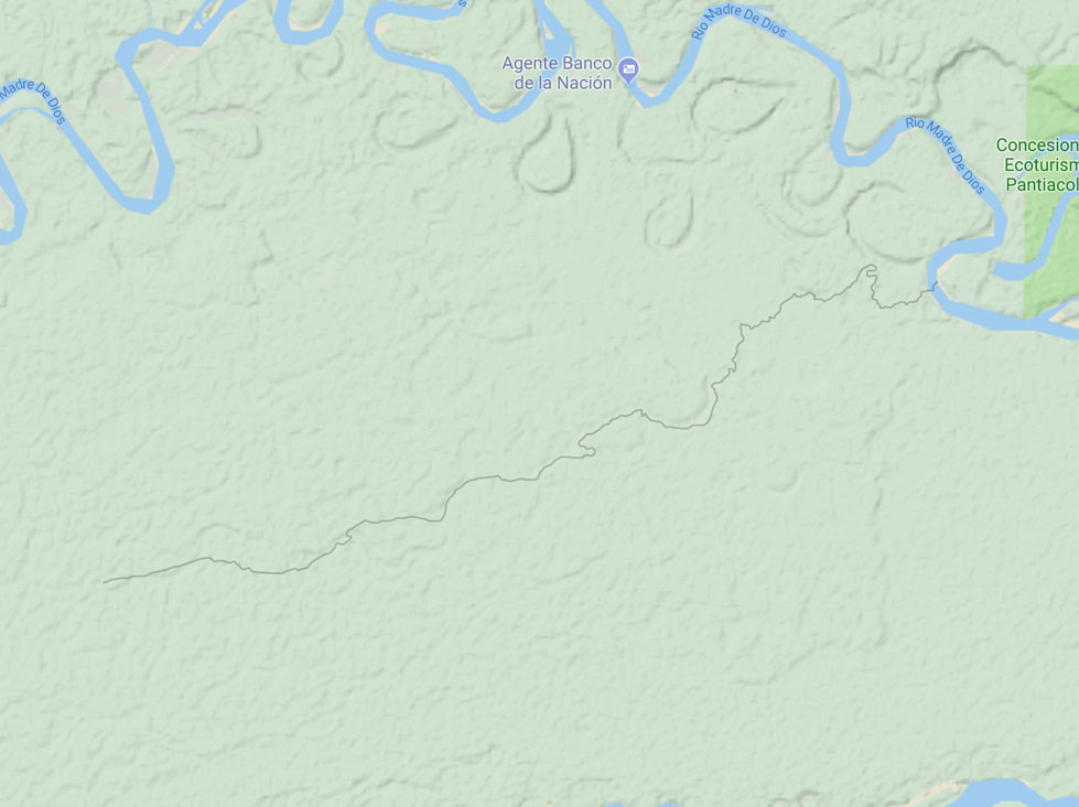 Either from the airport in Puerto Maldonado or Cusco it's a couple hours drive / overnight bus to Mazuko where we will procure a car to either the Inambari river (Puerto Carlos) or Ponal Lodge. After we arrive at our trekking start point (6 mi) we will begin walking due east along runoff/creek lines visible from sat views. After 3 or 4 miles we will begin to see more water filling the creek depending on the month (no earlier than April and no later than June) will determine the length of trek, but rest assured there is a wide canal / river mouth (30 - 40 ft wide) as we reach the Madre de Dios river 15.7 mi later. After reaching the river it's a 1.5 day rafting trip to Laberinto and bus stop to either Puerto Maldonado or Cusco.