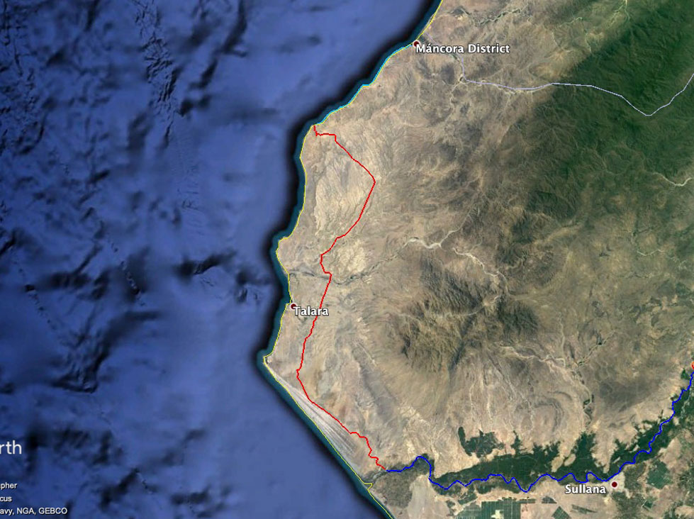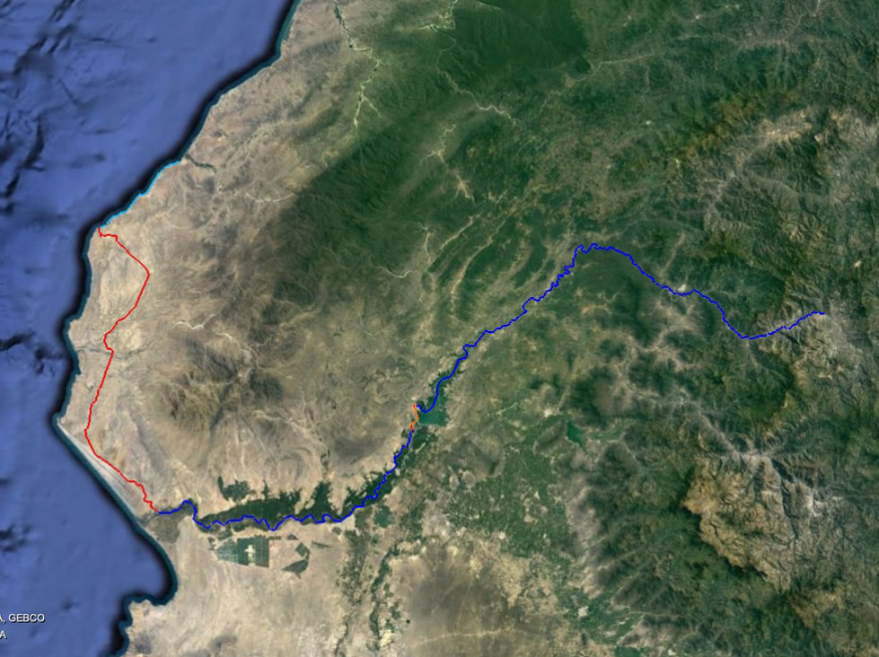 After rafting another 15mi we reach the Ecuadorian town of El Alamor where the border turns towards the northwest but the Chira river flows to the southwest. At 91mi the river begins to widen and soon forms the Poechos Reservoir which we paddle out of and right up to the (1N) highway. We'll pack up for a car portage which will take us a total of 12 miles through the Lacones District and Huaypira then along the reservoir and past the dam where we will get off and walk 1 mile to the Chira river canal (or river). We'll raft this man-made canal (a consistent 40 ft across) for 7 miles through agricutural plots then portage a mile to again packraft the Chira. We'll float by the town of Sullana and under the Panamericana Norte highway bridge then through more farmland and agricultural terraces which have now become surrounded by desert dunes and windblown beach sand. After one last riverbend at Vichayal we can get our first sight of the Pacific Ocean just before pulling into the small beach town of Miramar. We'll stay a night here at a basic hostal.